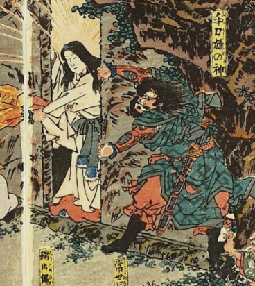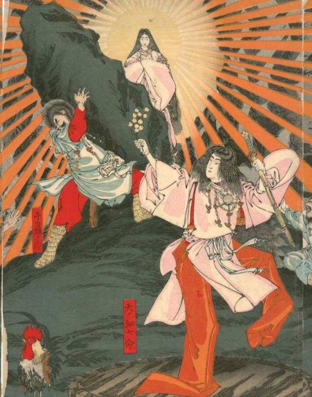 神々が岩戸の前で宴を開き、天宇受賣命(アメノウズメ)が舞い踊ると、外の賑やかさを不思議に思ったアマテラスが、岩戸を少しだけ開けました。その瞬間、岩戸の脇に隠れていた天手力男神が、アマテラスの手を引いて外へ引き出し、さらに巨大な岩の扉を投げ飛ばしたのです。