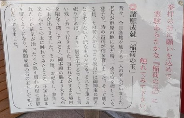 昔々、全国各地を旅する一人の老人がいました。老人が市原の地に来た時、一夜の宿をさがしていたので、時の宮司が宿を貸しました。そして明くる日、その老人から「この境内には御神宝に勝るとも劣らない立派なものがある。それを丁重にお祀りすれば、より一層繁栄するでしょう。」と言い残し去っていきました。言われるがままに境内を隈なく探してみると、御本殿の脇より大きな石の玉が出てきました。その後、お祀りし、参拝に来た人がこの玉に触れてみたところ、子宝に恵まれたとか病気が治ったとか数え切れぬ程の霊験を聞くようになり、諸願成就の石の玉として知れわたってきました。