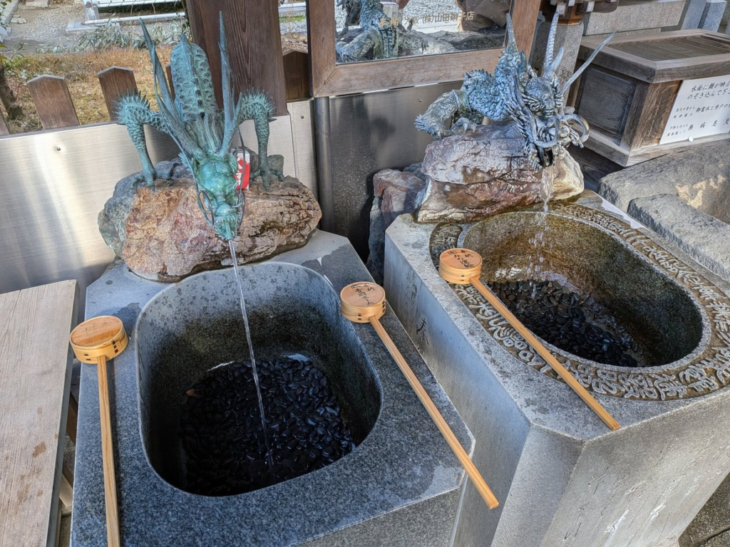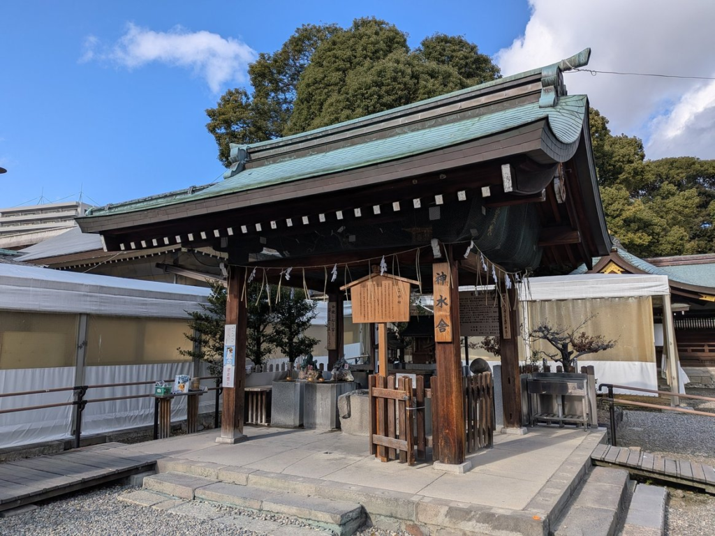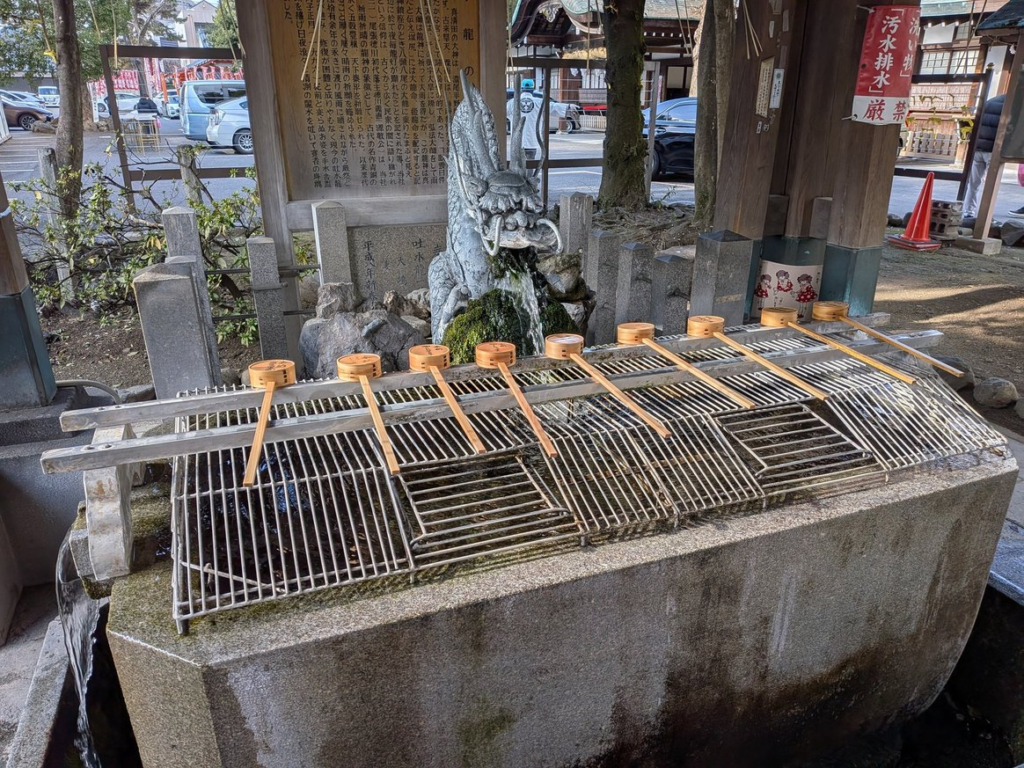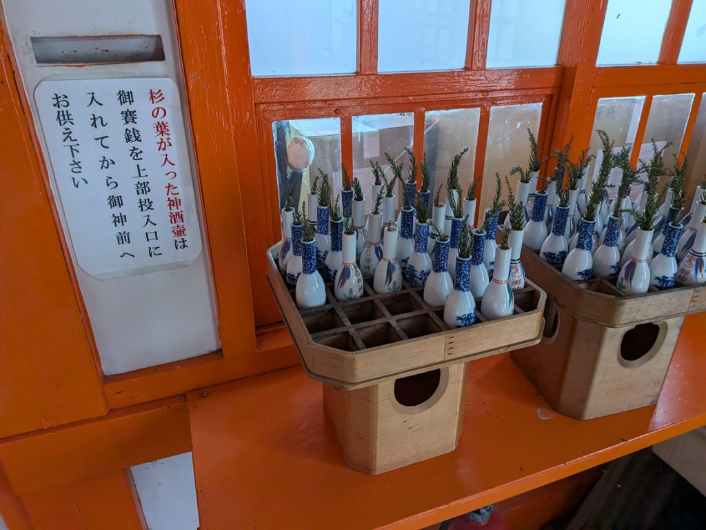 持ち帰りも可能で、社務所で水を持ち帰るための容器の販売が行われています。