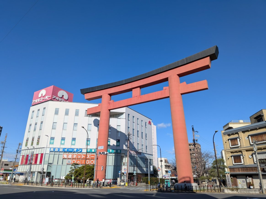 神社の入口には、名古屋市内でも有数の高さを誇る「中村の大鳥居」がそびえ立ちます。